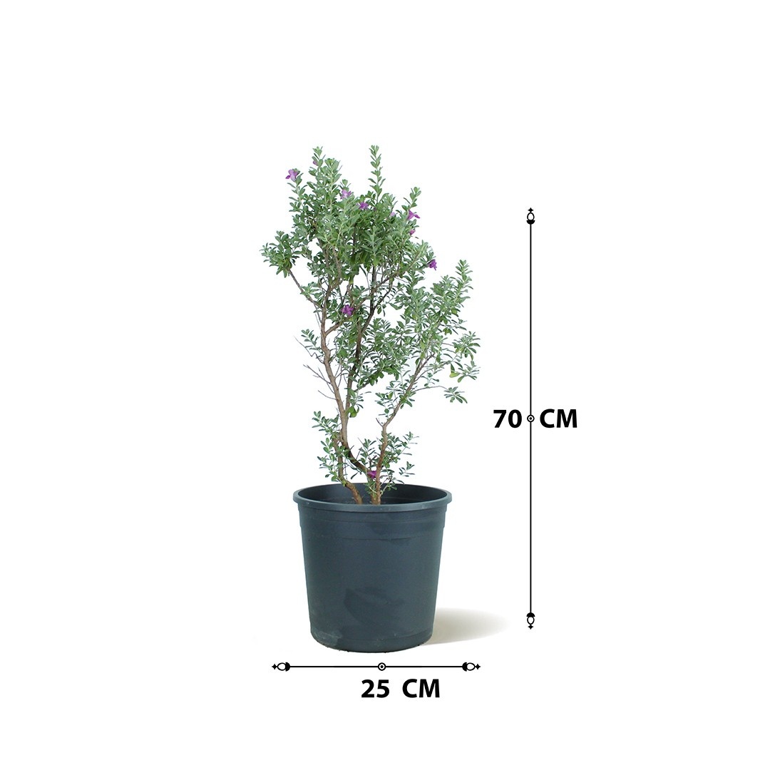 Leucophyllum Frutescens is a resilient outdoor ornamental shrub valued for its silvery-grey foliage and attractive purple flowers that appear seasonally. Its compact growth and drought tolerance make it a popular choice for gardens, borders, and landscaped outdoor areas.